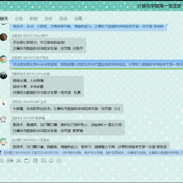 会议开始,主持人张皓哲通过分享屏幕PPT向参会成员介绍本次会议分为抗疫故事彰显制度优势,感想体会交流、重要文件学习三个部分。会议第一项,主持人通过视频图片展示医护工作者的奉献,呼吁大家心怀感恩,接着,通过播放抗疫视频,展示大国精神和大国力量,倡导大家增强“四个意识”、坚定“四个自信”、做到“两个维护”,自觉承担起社会责任。随后,党员杜勇、预备党员张嘉慧、积极分子王海博分别从身边的抗疫工作、近期开展的云班会、团会、疫情期间的志愿者工作三个方面讲述自己在疫情期间的感想体会。会议第三项,谢镒领学《中共河南城建学院委员会关于学习贯彻习近平总书记给在首钢医院实习的西藏大学医学院学生重要回信精神的通知》《关于发挥共产党员示范带头作用,推动形成文明健康、绿色环保生活方式的倡议》文件,大家纷纷响应文件要求,发出倡议口号。