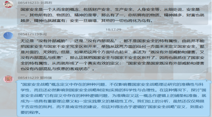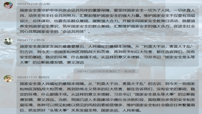 会议由豆智胜同志主持。会议第一项是学习全民国家安全教育日的背景、意义和作为一名党员应承担的责任。通过QQ群屏幕分享,张奥同志结合本次党日活动的PPT云党课内容进行讲解,主要内容有:为什么要设立“全民国家安全教育日”、设立“全民国家安全教育日”的重要意义、维护国家安全,我们该怎么做?结合此次党课所学内容,支部成员在讨论中进一步明确了国家安全教育的深刻内涵,并结合防疫实际,学生在家应该注意哪些安全等问题。随后,支部书记王梦琪同志和支部党员们共同参加了学习强国APP中的“全民国家安全教育日”线上专项答题活动。