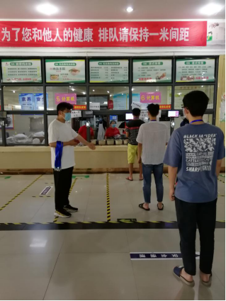 在本学院学生返校期间(2020年5月15日——5月22日),由我院学生党员组成的志愿服务突击队到学院就餐地点,与后勤工作人员一起维持餐厅进出口及餐厅内秩序,督促学生先扫码后就餐,管控就餐人数及错峰就餐秩序。