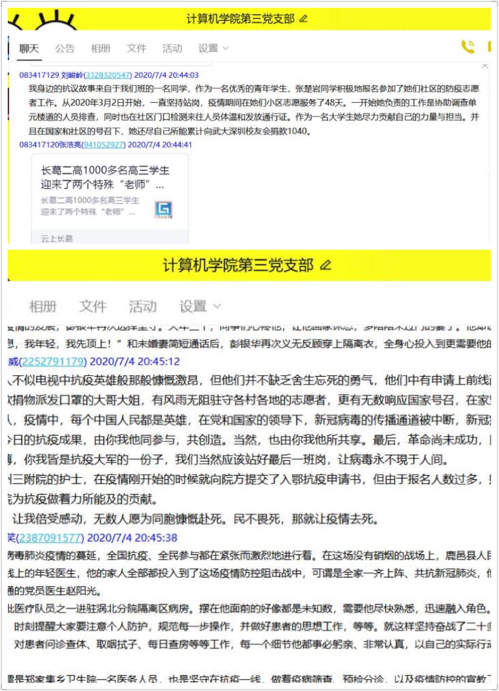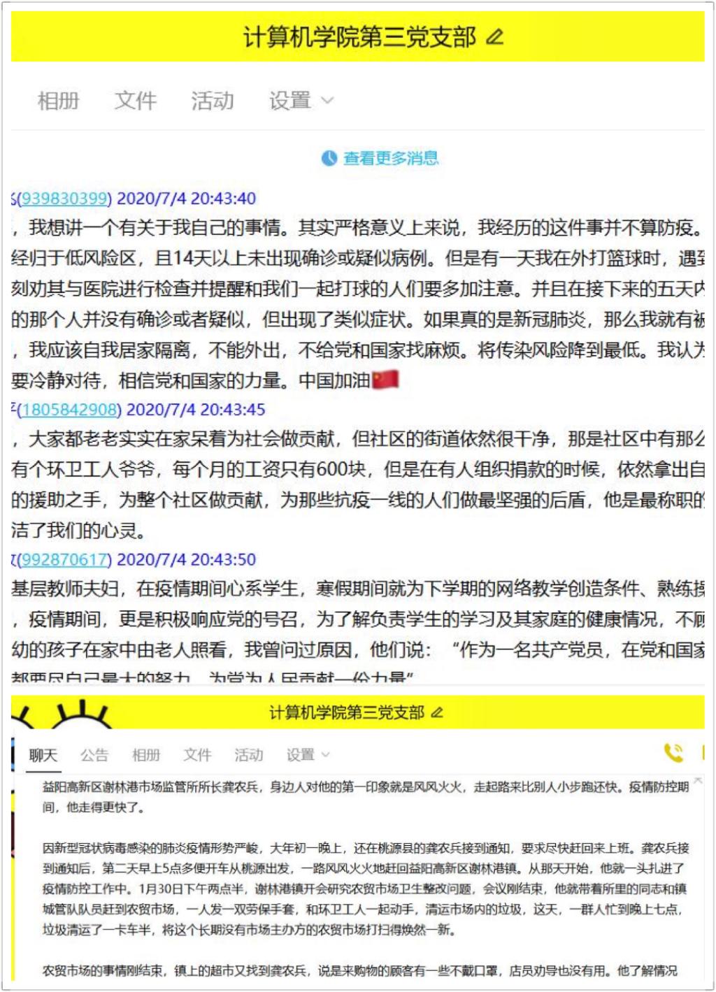 活动第三项,为贯彻落实学校常态化疫情防控“四个一”行动,讲好身边战“疫”故事,树立身边先锋榜样,学生第三党支部以“迎接党的生日、讲战疫故事、悟初心使命”为主题,展开了线上专题组织生活会。支部成员积极参与、热烈交流,踊跃发言,或结合自身经历,讲述自己的战“疫”故事,或由所看所思,描述身边动人的战“疫”事迹,与大家分享疫情防控期间自己的切身体会和身边故事。