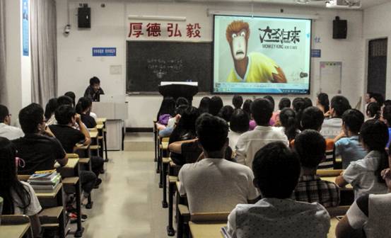 王付帅在创造了十亿元票房奇迹的北京燕城十月文化传播有限公司出品的电影《大圣归来》年轻的制作团队中,担任材质总监。他结合自己的工作经验,介绍了专业的动画电影制作技术、国内动画的发展现状及展望;同时也展示了动画工作人员台前幕后的工作细节及影片的一些珍贵手稿和资料;给同学们讲了作为动画人,初入职场时的困难,以及如何在困境中坚持直到完成自己的梦想。