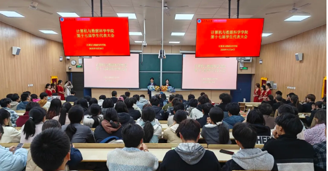 (通讯员任恒)2025年10月24日,计算机与数据科学学院第十七届学生代表大会在10号楼B105教室举行。院长赵军民、党委副书记张星出席大会,全体辅导员、广大学生干部及其他兄弟院系代表200余人参加大会。