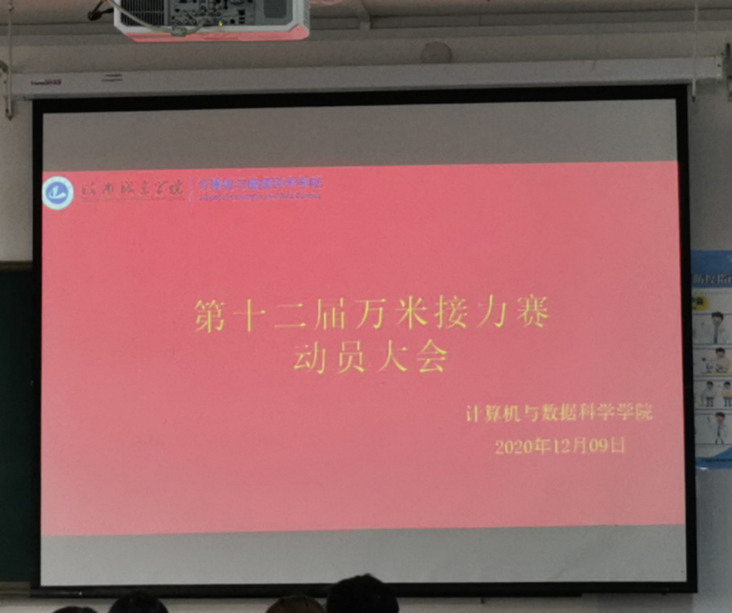 (通讯员 周岸 司飞尧)“两万五”接力赛将要到来,为充分调动运动员的积极性,保障比赛各项服务工作有序展开。2020年12月09日,计算机与数据科学学院“两万五”接力赛动员大会在十号楼a414顺利举行。本次参加人员有计算机学院党总支副书记张星、团总支书记兼学工办主任王梦琪、计算机与数据科学学院学生会主席团和全体运参赛人员。