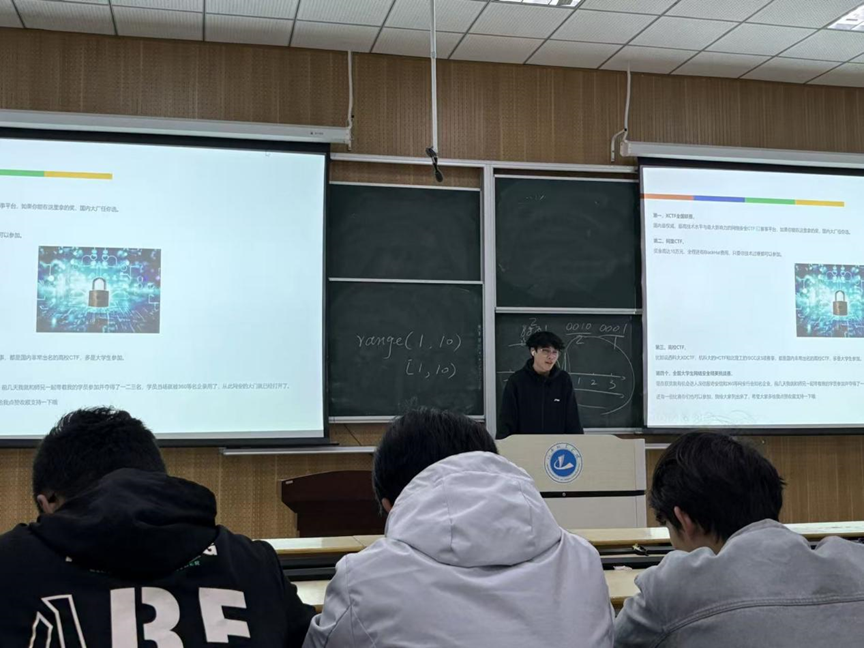 阚景润在校期间,对网络安全领域抱有浓厚的兴趣。这份热爱驱动他积极投身于各类学科竞赛,从省级赛场到国家级舞台,他凭借扎实的专业功底和出色的实战能力,屡获殊荣。分享中,他强调,竞赛并非目的,而是检验和提升自我的最佳途径。每一次备赛都是一次系统性的知识梳理和技能强化。他说道,“从一次次比赛中吸取经验教训,不断查漏补缺,我的技术栈日益丰富,解决实际问题的能力也得到飞速提升。”正是这种在竞赛中不断磨砺出的硬实力,为他赢得了进入知名企业实习的宝贵机会,让他在真实的企业环境中检验所学、拓展视野,完成了从理论到实践的完美闭环。针对新生普遍感到的迷茫,阚景润给出了自己的建议:“尽早找到自己的兴趣方向,并为之持续投入。”他鼓励学弟学妹们要敢于尝试,不要畏惧失败,将课堂上学习的理论知识与课外实践操作紧密结合,积极参与科创项目和学科竞赛,在“做”中学,在“战”中长。他真诚而富有感染力的分享,赢得了现场阵阵掌声。