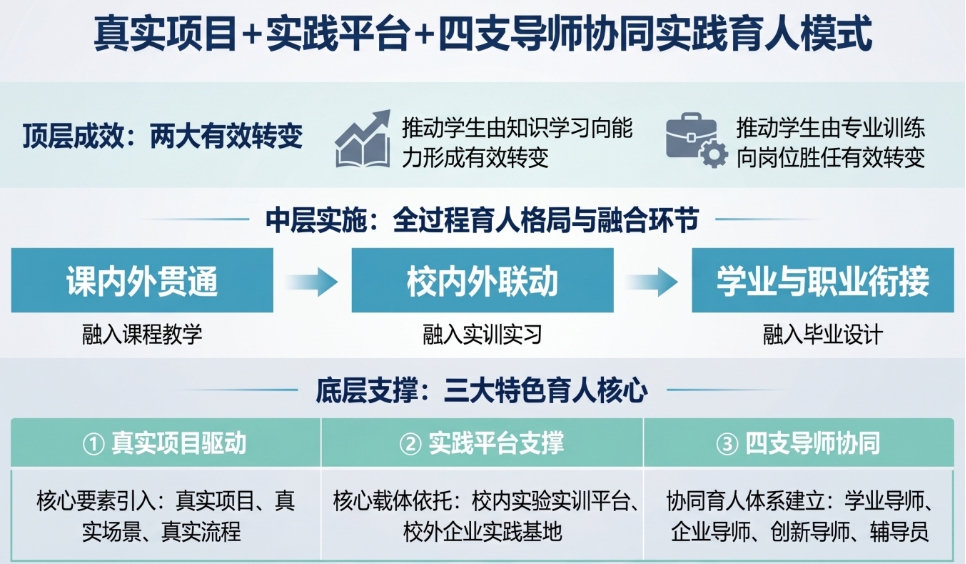 三是形成了“真实项目驱动、实践平台支撑、四支导师协同”的特色实践育人模式(图3)。依托校内外实验实训平台和企业实践基地,将真实项目、真实场景、真实流程融入课程教学、实训实习和毕业设计,建立由学业导师、企业导师、创新导师和辅导员构成的“四支导师”协同育人体系,构建课内外贯通、校内外联动、学业与职业衔接的全过程育人格局,推动学生由知识学习向能力形成、由专业训练向岗位胜任有效转变。