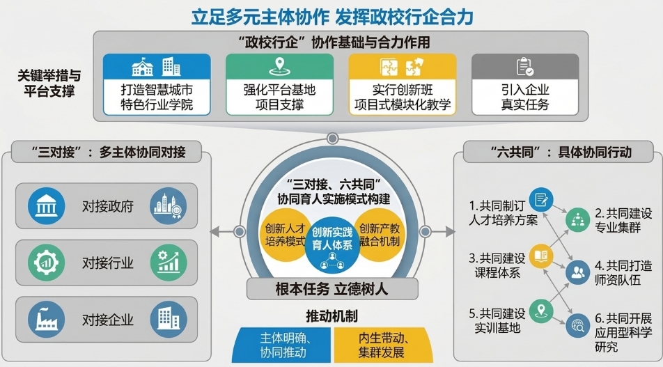 本教学成果主要基于河南城建学院主持完成的2024年度河南省高等教育教学改革研究与实践项目《“行业产教融合共同体”视阈下的特色行业学院建设研究与实践》(项目编号:2024SJGLX0475)的研究成果。项目立足国家深化产教融合需求,依托河南城建学院智慧城市特色行业学院,针对人才培养与产业需求衔接不紧、协同育人机制不强等问题开展研究与实践,形成了三位一体建设模式、“三对接、六共同”协同育人机制和特色实践育人模式。具体成果如下: