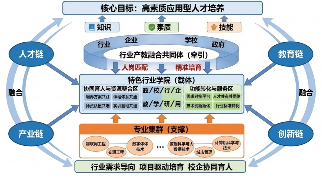 图1 “行业产教融合共同体、特色行业学院、专业集群”建设模式